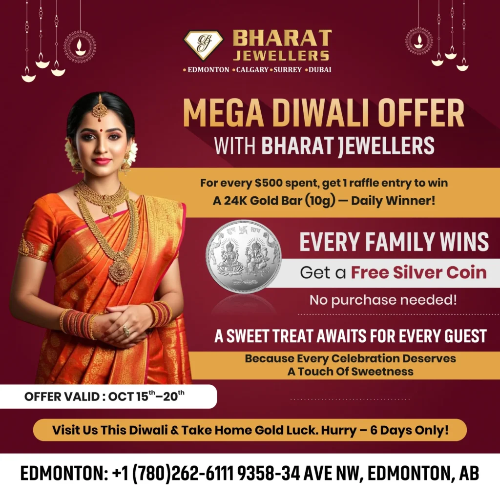 Celebrate the festival of lights with glittering deals on gold, diamond, and precious jewellery. This Diwali, Bharat Jewellers is spreading joy with special walk-in gifts for everyone! No purchase needed — just visit our stores in Surrey, Calgary, and Edmonton.